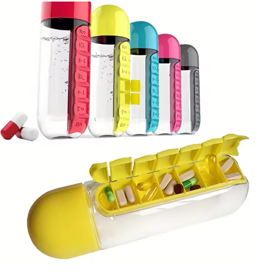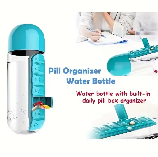 💊 2-in-1 Design – Combines a 600ml (20.3oz) water bottle with a 7-day pill organizer, making it super convenient for daily medication and hydration.