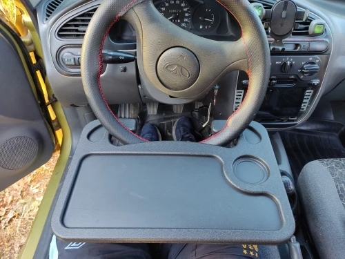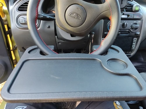 Easily attaches to any car steering wheel, converting it into a convenient desk or tray for dining, working, or enjoying a drink on the go.